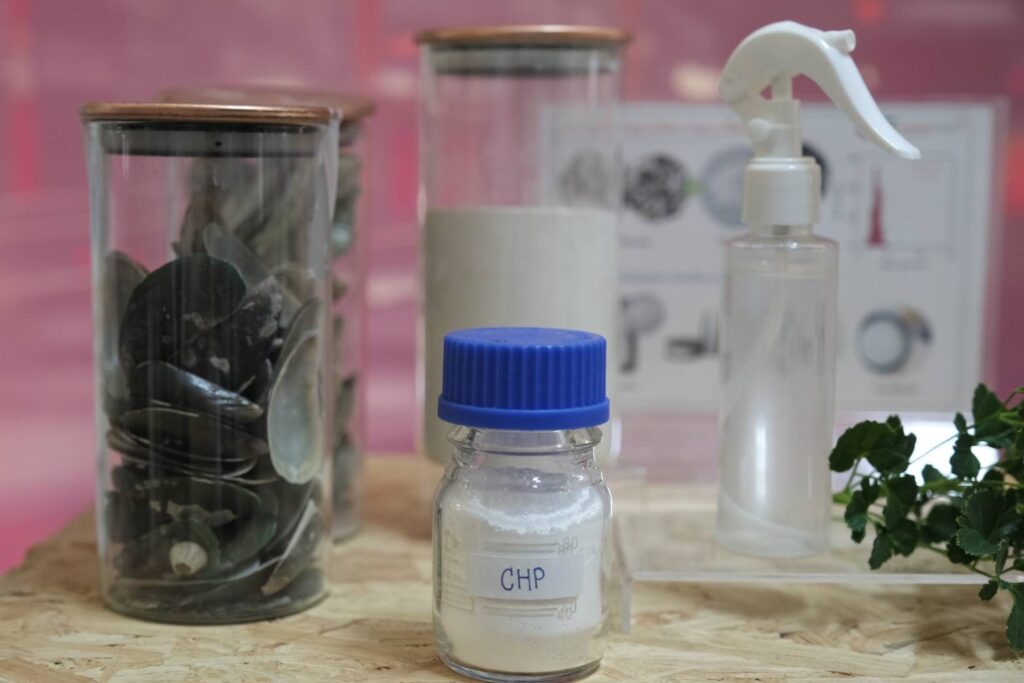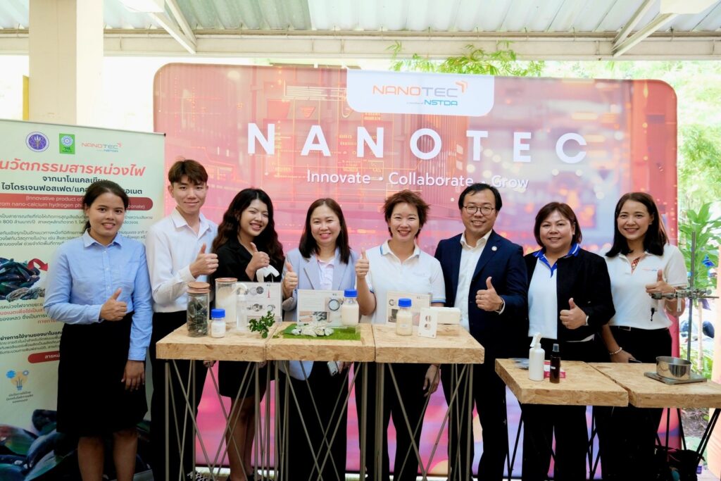 ผลงานวิจัยเรื่อง “ผลิตภัณฑ์นวัตกรรมสารหน่วงไฟจากนาโนแคลเซียมไฮโดรเจนฟอสเฟต/แคลเซียมคาร์บอเนต” โดย ดร. ชุติพันธ์ เลิศวชิรไพบูลย์ ทีมวิจัยวัสดุตอบสนองระดับนาโน (RNM) กลุ่มวิจัยวัสดุตอบสนองและเซ็นเซอร์ระดับนาโน (RMNS) โดยทุนอุดหนุนการวิจัยจากสำนักงานการวิจัยแห่งชาติ (วช.) นั้น เป็นการแปรรูปขยะเปลือกหอย (หอยแมลงภู่, หอยนางรม ฯลฯ) เป็นแคลเซียมคาร์บอเนตเพื่อใช้เป็นสารตั้งต้นสำหรับผลิตสารหน่วงไฟ ซึ่งเป็นการพัฒนาต่อยอดให้ขยะเปลือกหอยเป็นวัสดุขั้นสูง สร้างมูลค่าให้กับขยะทางการเกษตร การเตรียมสารหน่วงไฟจากนาโนแคลเซียมไฮโดรเจนฟอสเฟต/แคลเซียมคาร์บอเนตสามารถเตรียมให้อยู่ในรูปแบบของแข็งลักษณะเป็นผง และของเหลวได้ ตัวอย่างการใช้งานของนาโนแคลเซียมไฮโดรเจนฟอสเฟต/แคลเซียมคาร์บอเนตสามารถทำให้กระจายตัวในน้ำสำหรับฉีดพ่นบนพื้นที่ต้องการให้มีคุณสมบัติหน่วงไฟ หรือผสมกับพอลิเมอร์เพื่อผลิตเป็นชิ้นงานที่มีคุณสมบัติหน่วงไฟ เช่น ผสมสารหน่วงไฟกับพลาสติกขึ้นรูปเป็นเส้นสำหรับการพิมพ์ชิ้นงานด้วยกระบวนการพิมพ์สามมิติ เป็นต้น