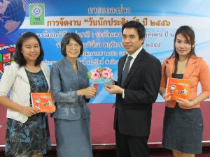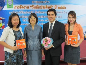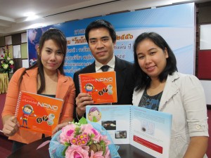 เมื่อวันที่ 24 มกราคม นางกาญจนา ปานข่อยงาม รองเลขาธิการคณะกรรมการวิจัยแห่งชาติ มอบช่อดอกไม้แสดงความยินดีกับ ดร.ณัฐพันธุ์ ศุภกาและคณะ จากศูนย์นาโนเทคโนโลยีแห่งชาติ (นาโนเทค) สำนักงานพัฒนาวิทยาศาสตร์และเทคโนโลยีแห่งชาติ (สวทช.) ซึ่งได้รับรางวัลประกาศเกียรติคุณ ด้านสังคมศาสตร์ แก่ผลงานประดิษฐ์ เรื่อง สื่อการเรียนการสอน : หนังสือกิจกรรมทดลองนาโนเทคโนโลยี ในงานแถลงข่าวรางวัลสภาวิจัยแห่งชาติ :รางวัลผลงานประดิษฐ์คิดค้น ประจำปี 2556 ที่สำนักงานคณะกรรมการวิจัยแห่งชาติ (วช.) ถ.พหลโยธิน เขตจตุจักร กทม.
