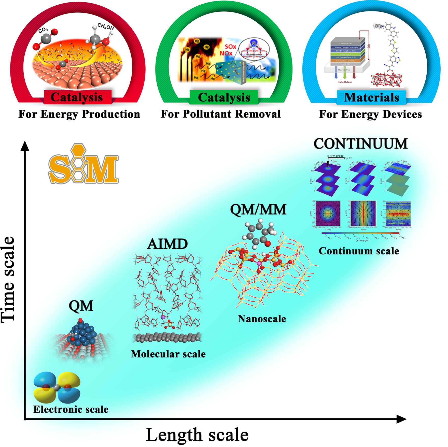 Nanoscale simulation research team (SIM) has extensive experiences in the nanoscale modeling and simulations for both fundamental scientific findings and practical industrial significances. We aim to design and predict the properties of functional nanomaterials, and to create a unique understanding of the physicochemical processes at the nanoscale level. Our expertise includes first principles computational approaches, molecular dynamic simulation, hybrid QM/MM simulation, enabling the in-depth analysis of molecular interactions and electronic transports for various applications such as catalysis, pollutant removal, and energy devices. This ‘in silico’ insight can accelerate the experimental research and development of nanotechnology applications in the fields of energy and environment.
