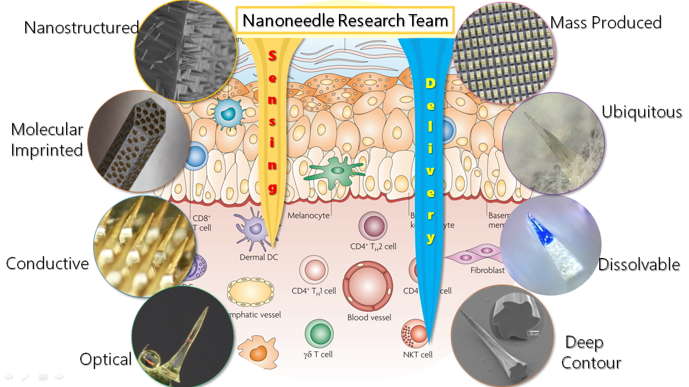 Our research team aims to develop biological interfaces for mass and information transfers between the human body and the environment via minimally invasive micro/nanostructured devices. Unlike conventional interfaces, our technologies are capable of reciprocal communication with high accuracy and precision while avoiding stimulating pain receptors and damaging blood vessels. Our research has started from introducing new concepts to build platforms for mass production. Nanoneedles – micro-scale pointed rod-like structures with nanostructured surfaces – have been tailor-engineered and fabricated into various shapes, aspect ratios, interspacing lengths, patch areas, and compositions to create specific functionalities suitable for emerging applications. Such applications include drug delivery, biosensors, sensory devices, and brain-computer interfaces. By using intelligent data analysis, our systems can handle and control the response of such communications and transfers with ease.