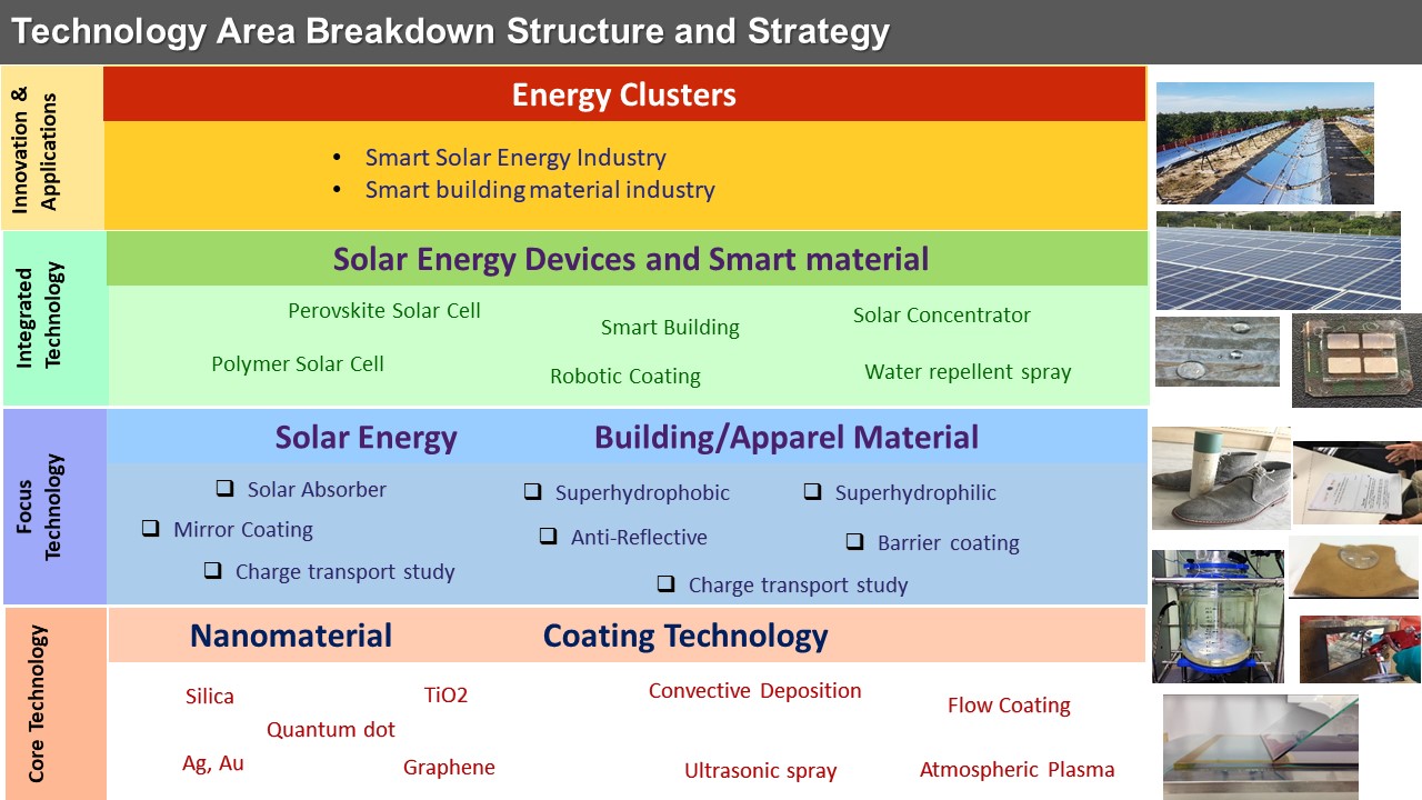 We also aim to drive innovative research on sustainable solar energy especially organic/hybrid photovoltaic and solar concentrator using our core technologies developed at NANOTEC. In addition, we also focus on integrating nanotechnology such as low-cost and multifunction coating to domestic industrial products especially in building and apparel material