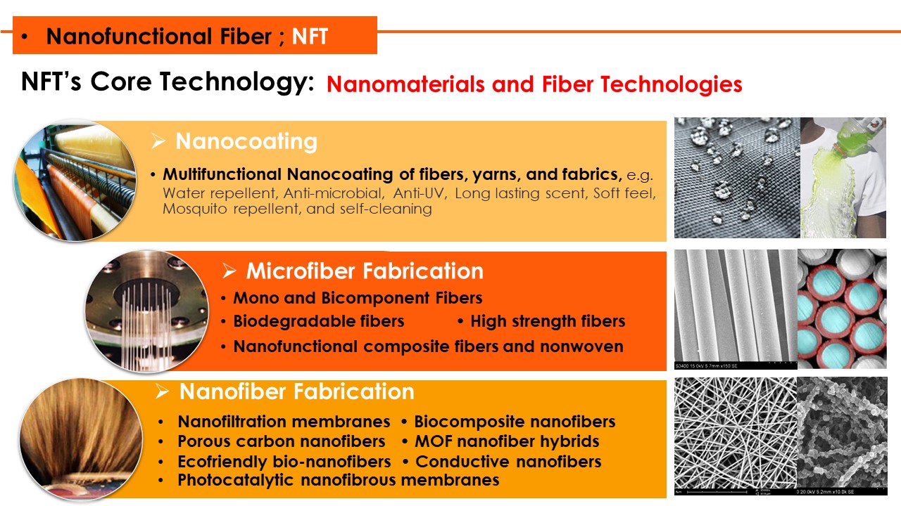 NFT’s work scope generally spans across the whole value chain of textile industries. Our research team hopes to create and bring values to the upstream by incorporating nanomaterials into fibers for multifunctionalities. We are also driving downstream by developing multifunctional nanocoating for various types of fabrics. Multifunctional nanofiber research is our newly emerging field of scientific and industrial interest for advanced applications in biomedical textiles such as nanofiltration, tissue engineering and drug delivery. Furthermore, we aim at introducing some of these novel materials, process and functions to the real word via smart and wearable electronics.