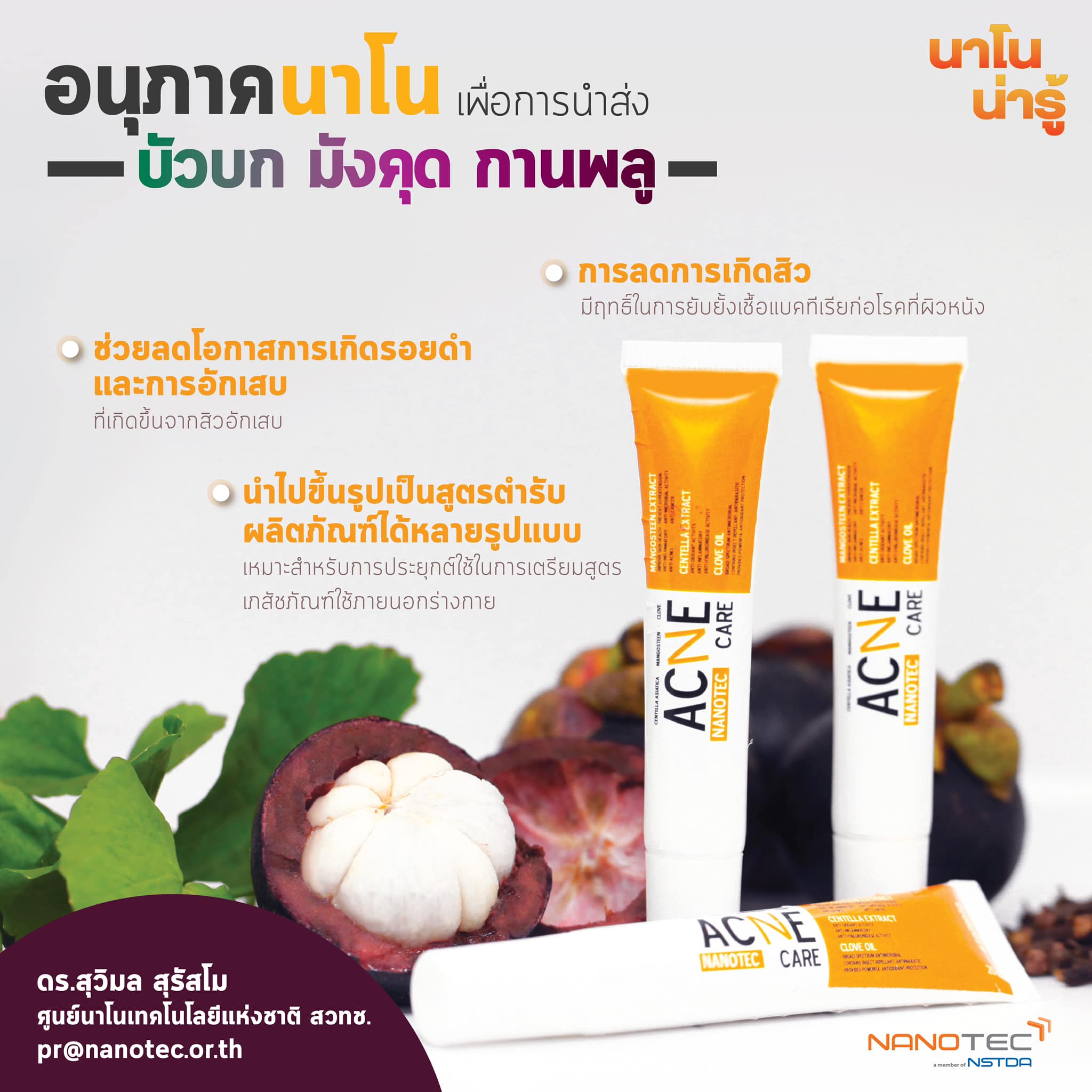 อนุภาคนาโนเพื่อการนำส่งบัวบก มังคุด กานพลู เป็นสารสกัดที่ได้จากธรรมชาติ มีคุณสมบัติที่โดดเด่นทั้งทางชีวภาพและทางเภสัชศาสตร์ คือ การลดการเกิดรอยดำ ฤทธิ์ต้านการอักเสบได้ใกล้เคียงกับยาไดโคลฟีแนก รวมถึงความสามารถในการยับยั้งเชื้อแบคทีเรียที่ผิวหนังซึ่งเป็นสาเหตุที่ก่อให้เกิดสิว ดังนั้นการนำสรรพคุณของสารออกฤทธิ์ทั้ง 3 ชนิดมารวมกันจะทำให้เป็นการเพิ่มศักยภาพและมูลค่าของผลิตภัณฑ์ได้ สามารถนำไปขึ้นรูปเป็นสูตรตำรับผลิตภัณฑ์ได้หลายรูปแบบ เหมาะสำหรับการประยุกต์ใช้ในการเตรียมสูตรเภสัชภัณฑ์ใช้ภายนอกร่างกาย เพิ่มความสามารถในการซึมผ่านชั้นผิวหนังของอนุภาคได้อย่างมีประสิทธิภาพ
