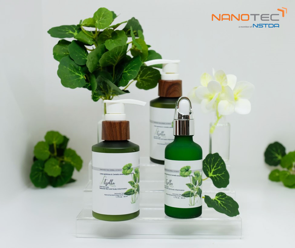 นาโนเทค สวทช. นำสารสกัดใบหมี่ที่ความสามารถในการกระตุ้นการเจริญเติบโตของเซลล์รากผมและสารสกัดจากใบบัวบกที่มีฤทธิ์ในการต้านการอักเสบของผิวหนัง มาพัฒนาอนุภาคลิโพนิโอโซมของสารสกัดใบหมี่ บัวบก และใบหมี่ผสมบัวบก ด้วยระบบห่อหุ้มที่ช่วยเพิ่มความคงตัวของสารสกัด พร้อมทั้งพัฒนาคุณสมบัติทางกายภาพเชิงเคมี รวมถึงผ่านการทดสอบการระคายเคืองในอาสาสมัคร จนสามารถพัฒนาต้นแบบแชมพู ครีมนวดผม และแฮร์โทนิคจากสารสกัดใบหมี่ผสมบัวบกที่ปราศจากพาราเบน แอลกอฮอลล์ และสารก่อความระคายเคืองอื่นๆ พร้อมยื่นจดทรัพย์สินทางปัญญาต่อไปค่ะ