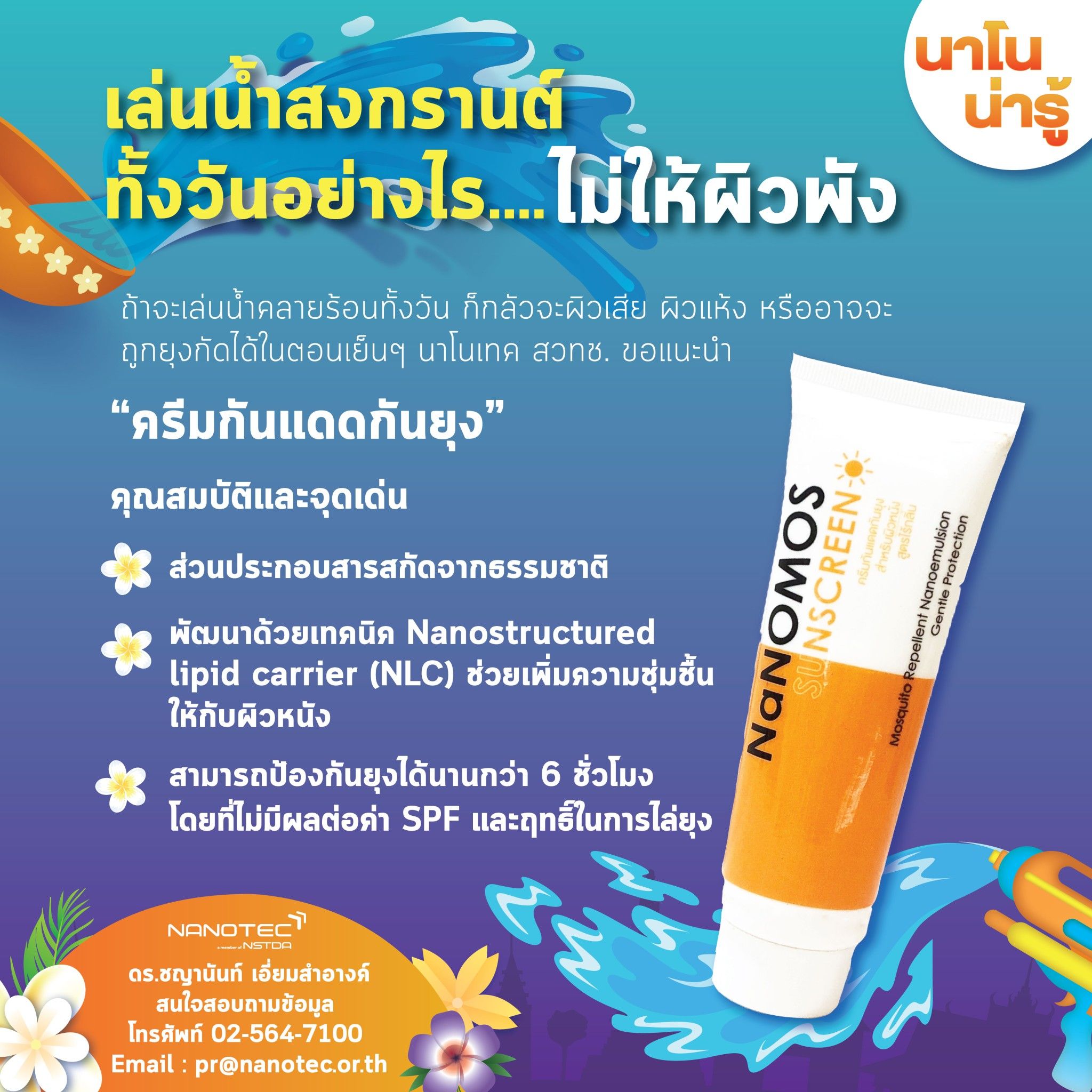 ถ้าจะเล่นน้ำคลายร้อนทั้งวัน ก็กลัวจะผิวเสีย ผิวแห้ง หรืออาจจะถูกยุงกัดได้ในตอนเย็นๆ นาโนเทค สวทช. ขอแนะนำ “ครีมกันแดดกันยุง” ซึ่งมีส่วนประกอบสารสกัดจากธรรมชาติ ปลอดภัยต่อผู้ใช้และพัฒนาด้วยเทคนิค Nanostructured lipid carrier (NLC) ช่วยเพิ่มความชุ่มชื้นให้กับผิวหนัง นอกจากนั้นยังมีคุณสมบัติพิเศษสามารถป้องกันยุงได้นานกว่า 6 ชั่วโมง โดยที่ไม่มีผลต่อค่า SPF และฤทธิ์ในการไล่ยุง (ผลจากห้องทดสอบของกองกีฏวิทยาทางการแพทย์ กรมวิทยาศาสตร์การแพทย์ กระทรวงสาธารณสุข) ทีนี้จะเล่นน้ำสงกรานต์ทั้งวันก็ไม่ต้องกลัวผิวพังแล้วค่ะ