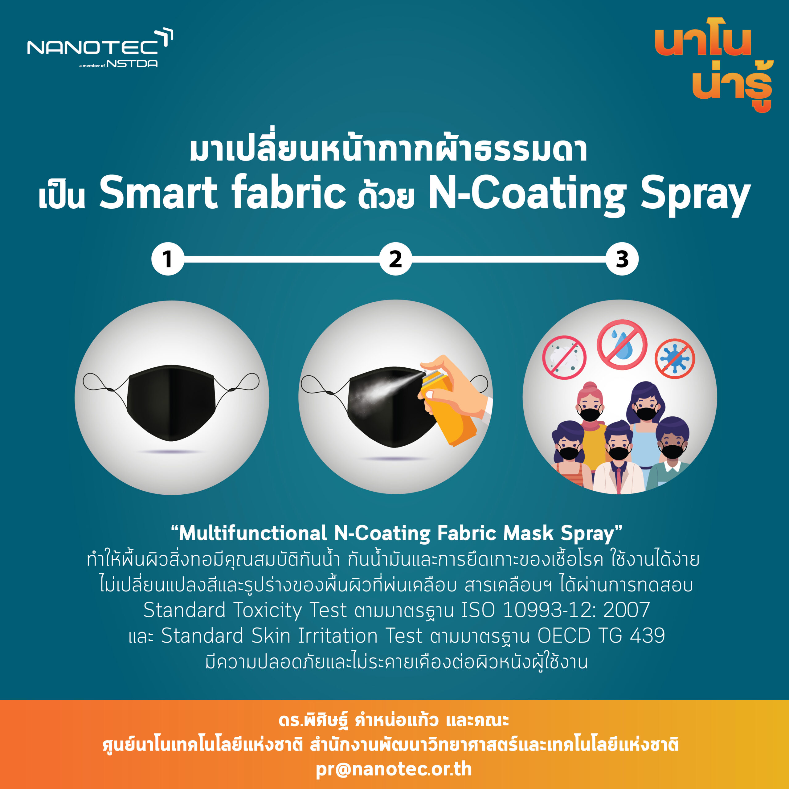 “Multifunctional N-Coating Fabric Mask Spray” คือ สเปรย์เคลือบหน้ากากผ้า ทำให้พื้นผิวสิ่งทอมีคุณสมบัติกันน้ำ กันน้ำมันและการยึดเกาะของเชื้อโรค ใช้งานได้ง่าย ไม่เปลี่ยนแปลงสีและรูปร่างของพื้นผิวที่พ่นเคลือบ โดยสารเคลือบฯ ได้ผ่านการทดสอบ Standard Toxicity Test ตามมาตรฐาน ISO 10993-12: 2007 และ Standard Skin Irritation Test ตามมาตรฐาน OECD TG 439 พบว่ามีความปลอดภัยและไม่ระคายเคืองต่อผิวหนังผู้ใช้งานค่ะ