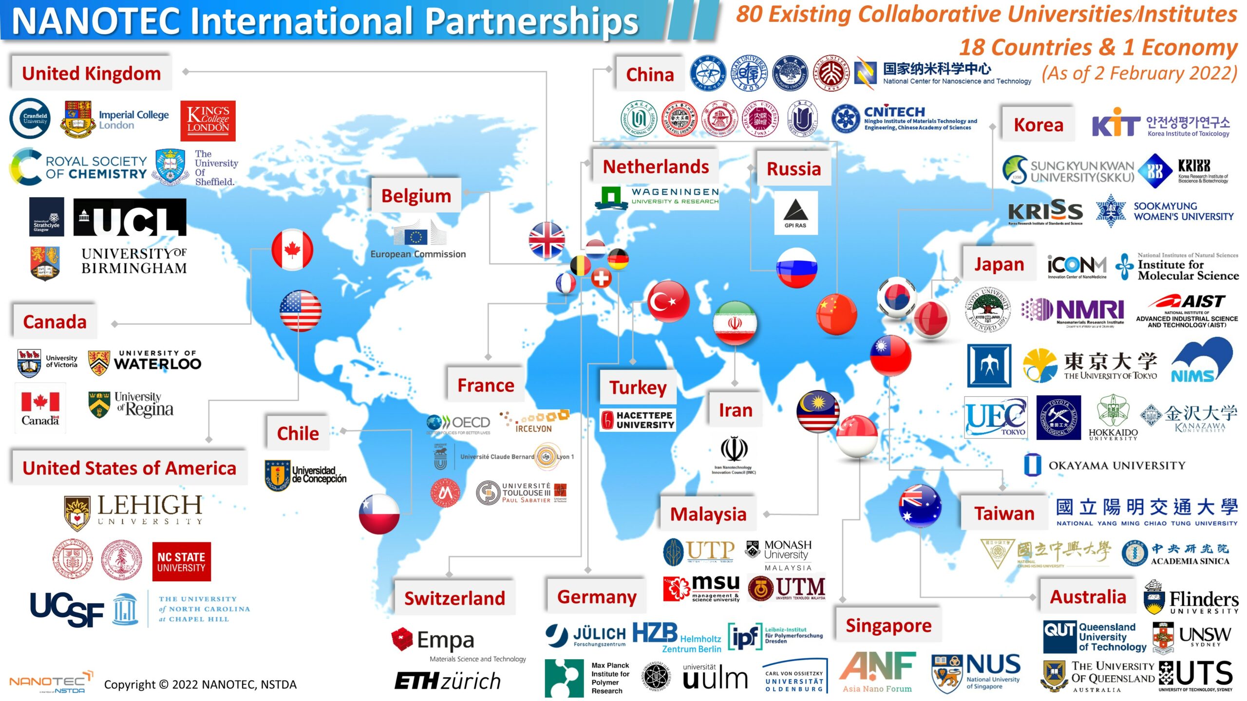 ข้อมูล ณ วันที่ 2 กุมภาพันธ์ 2565 หน่วยงานพันธมิตรต่างประเทศและสาขาความร่วมมือ (NANOTEC International Partnerships and Area of Collaboration in 2022) ในปีงบประมาณ 2565 มีจำนวน 80 มหาวิทยาลัย/สถาบัน จาก 18 ประเทศและ 1 เขตเศรษฐกิจ